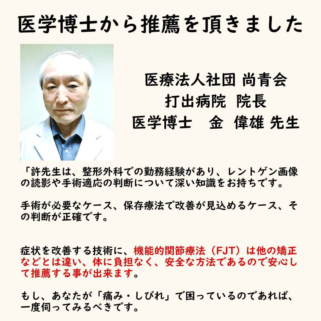 機能的関節療法( FJT )アドバンスコース修了の認定を受けています。